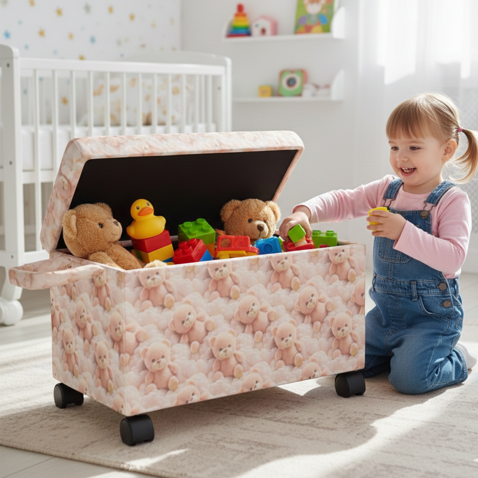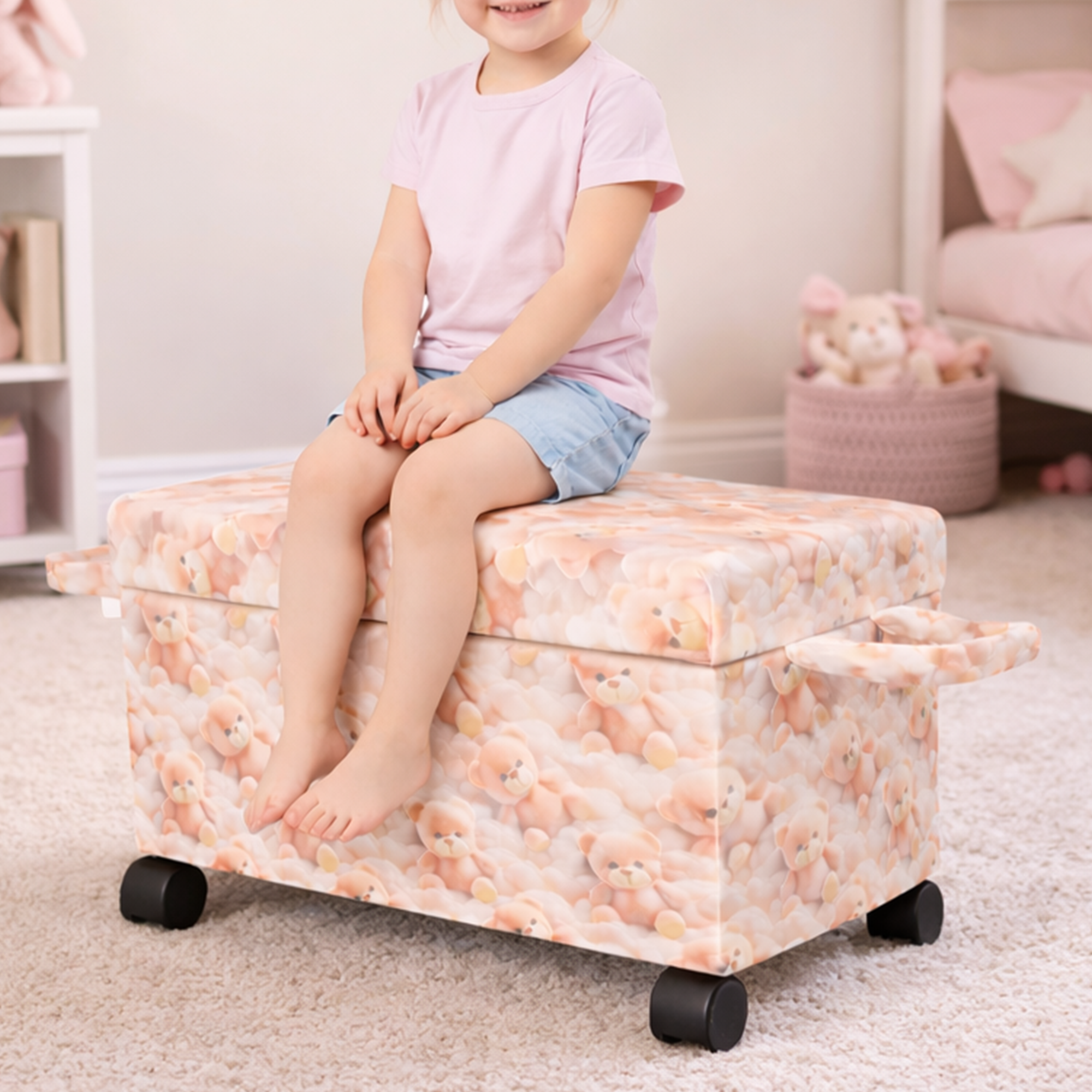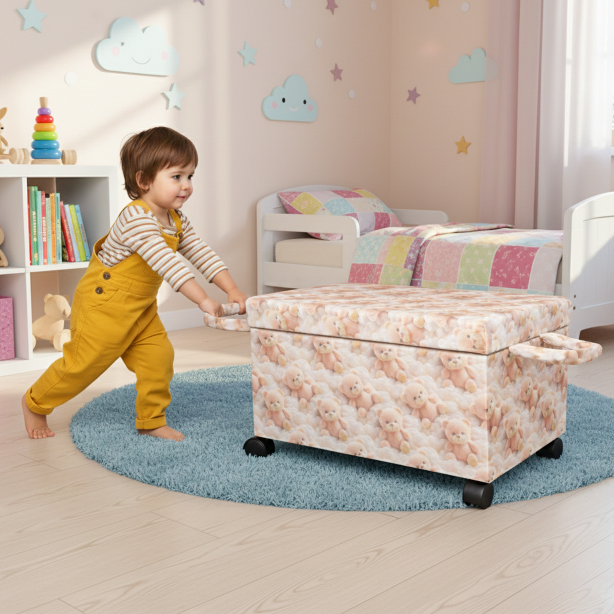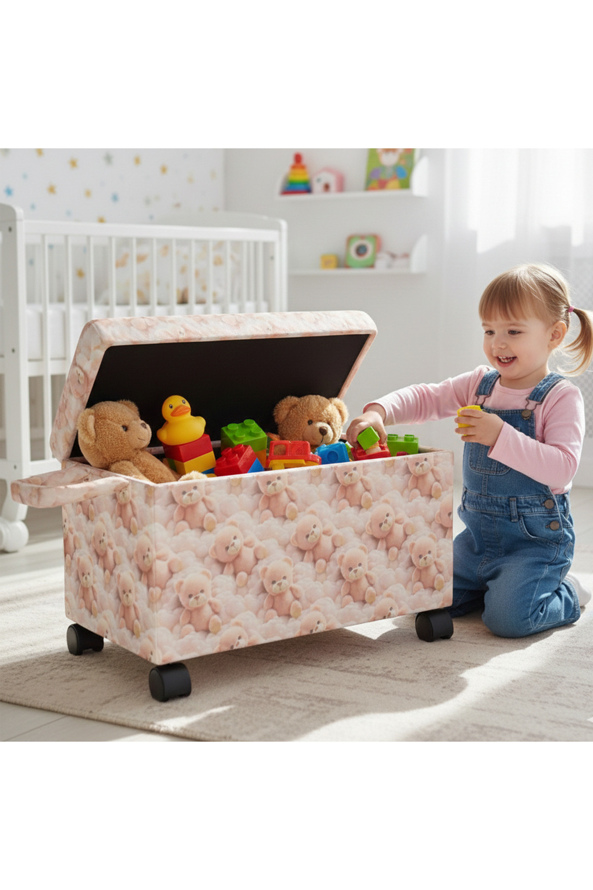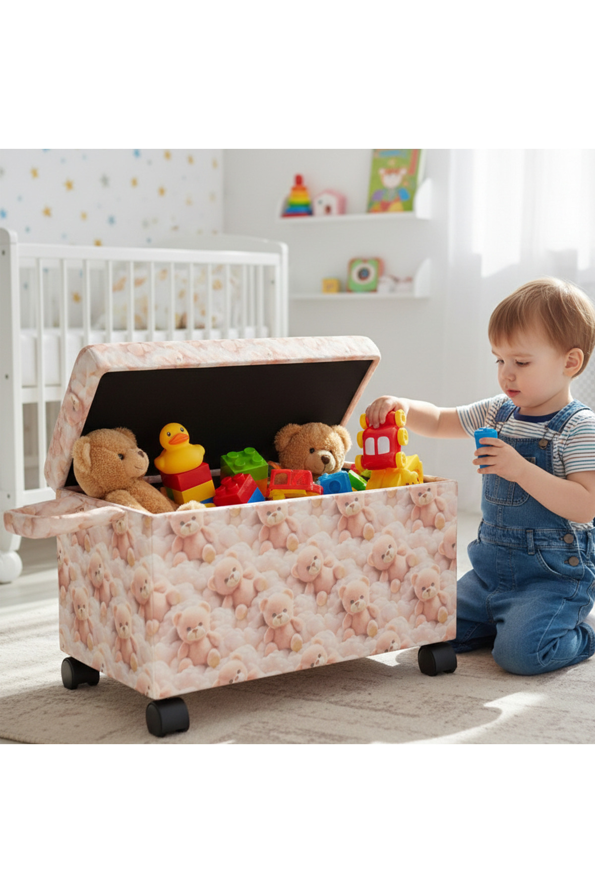 Ayıcık Figürlü Tekerlekli Oyuncak Sandığı/Pufu – Kapaklı Çocuk Odası Saklama Kutusu