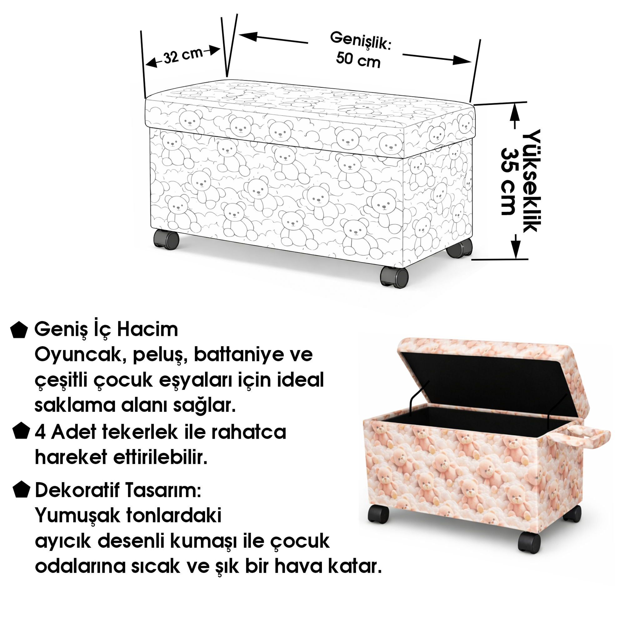 Ayıcık Figürlü Tekerlekli Oyuncak Sandığı/Pufu, çocuk odalarınız için ideal bir saklama ve dekorasyon çözümüdür. 35 cm yükseklik, 50 cm genişlik ve 32 cm derinlik ölçülerinde, suntalem kasa malzemesinden üretilmiştir. Dönen tekerlekli ayakları ve pembe ayıcık figürlü tasarımı ile çocuklarınızın odalarını renklendirecek bir seçenektir. Kapaklı yapısı ve geniş iç hacmi, oyuncakları ve eşyaları güvenli bir şekilde saklamanızı sağlar.