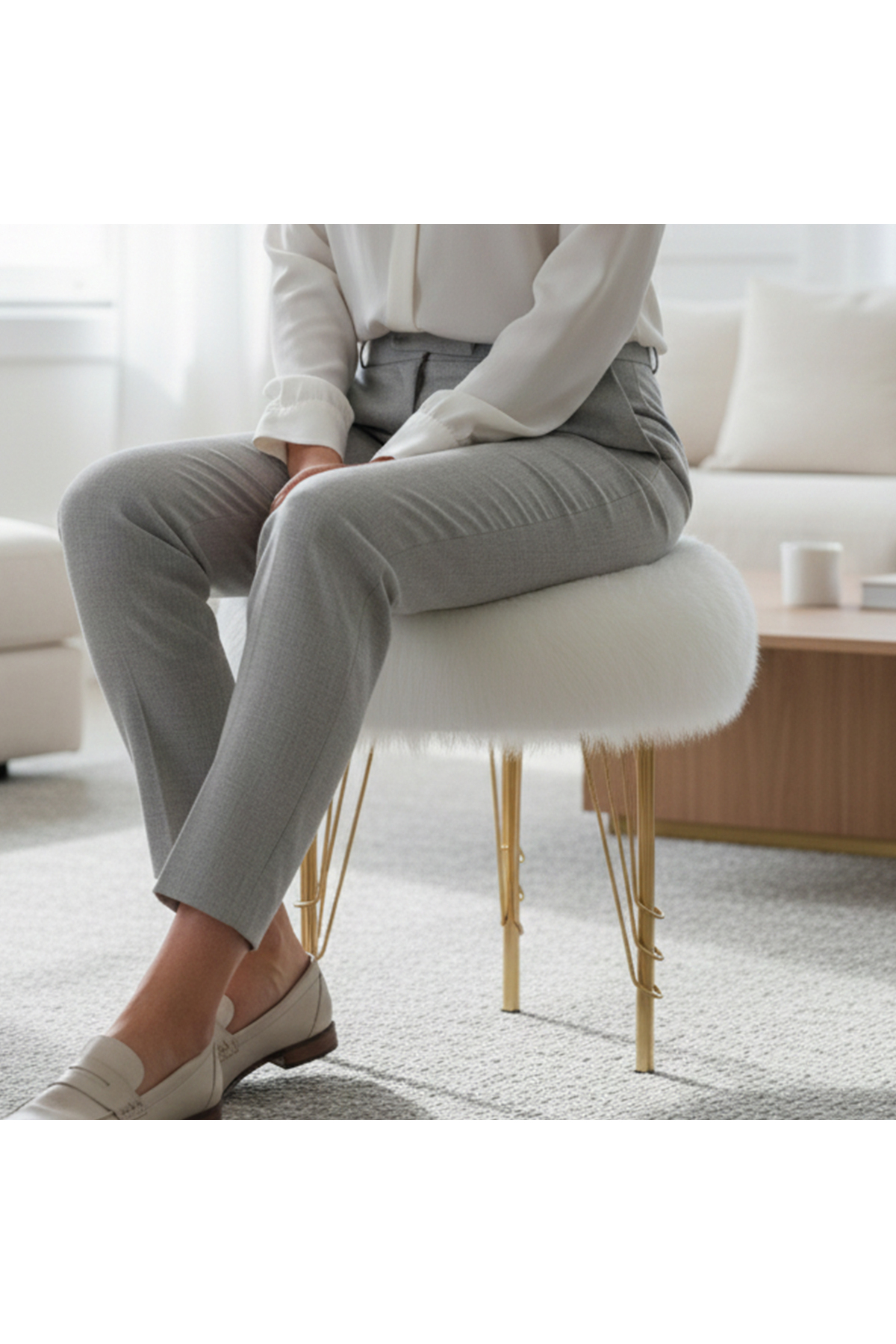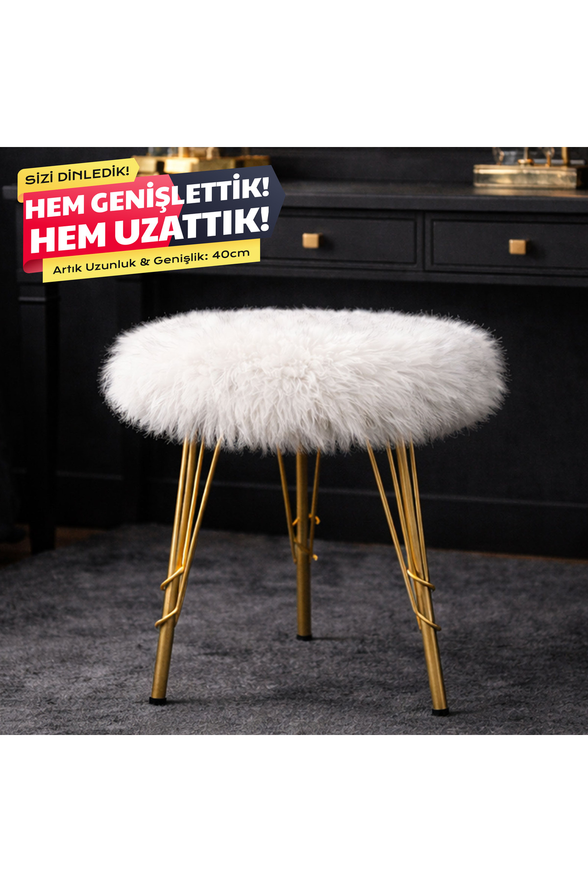 Beyaz Peluş Puf Tabure, Metal Ayaklı Yumuşak Oturma Pufu (40×40 cm) Yatak Odası, Salon Pufu (Yeni!)