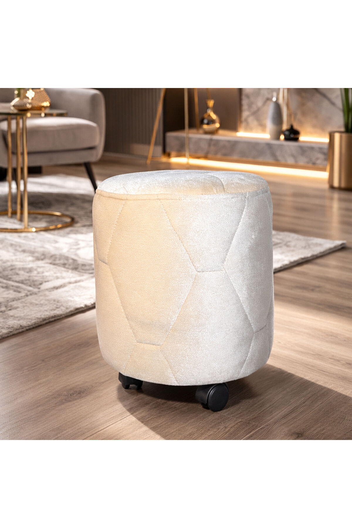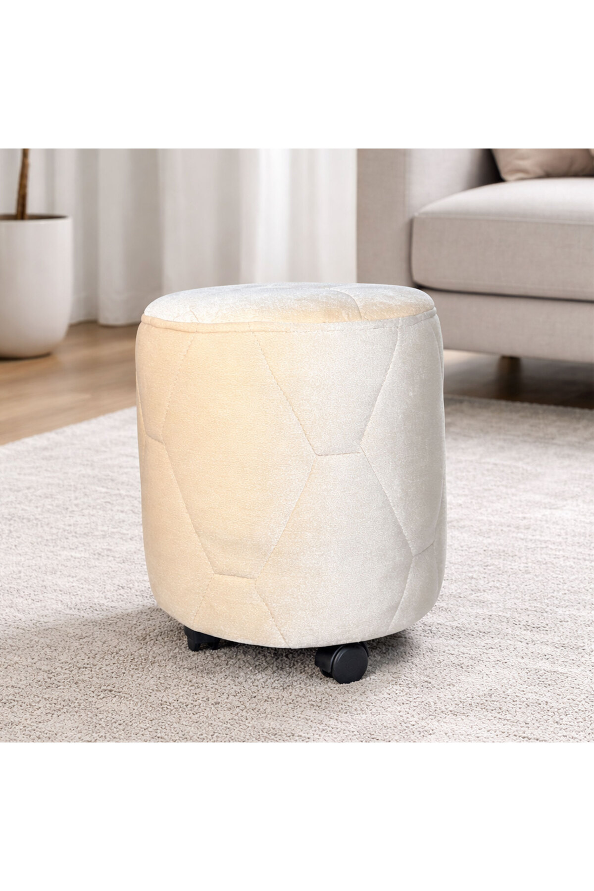 Krem Luna Kumaş Tekerlekli Puf Tabure – 5 Tekerlekli Makyaj Koltuğu – Sağlam Kasalı Oturak