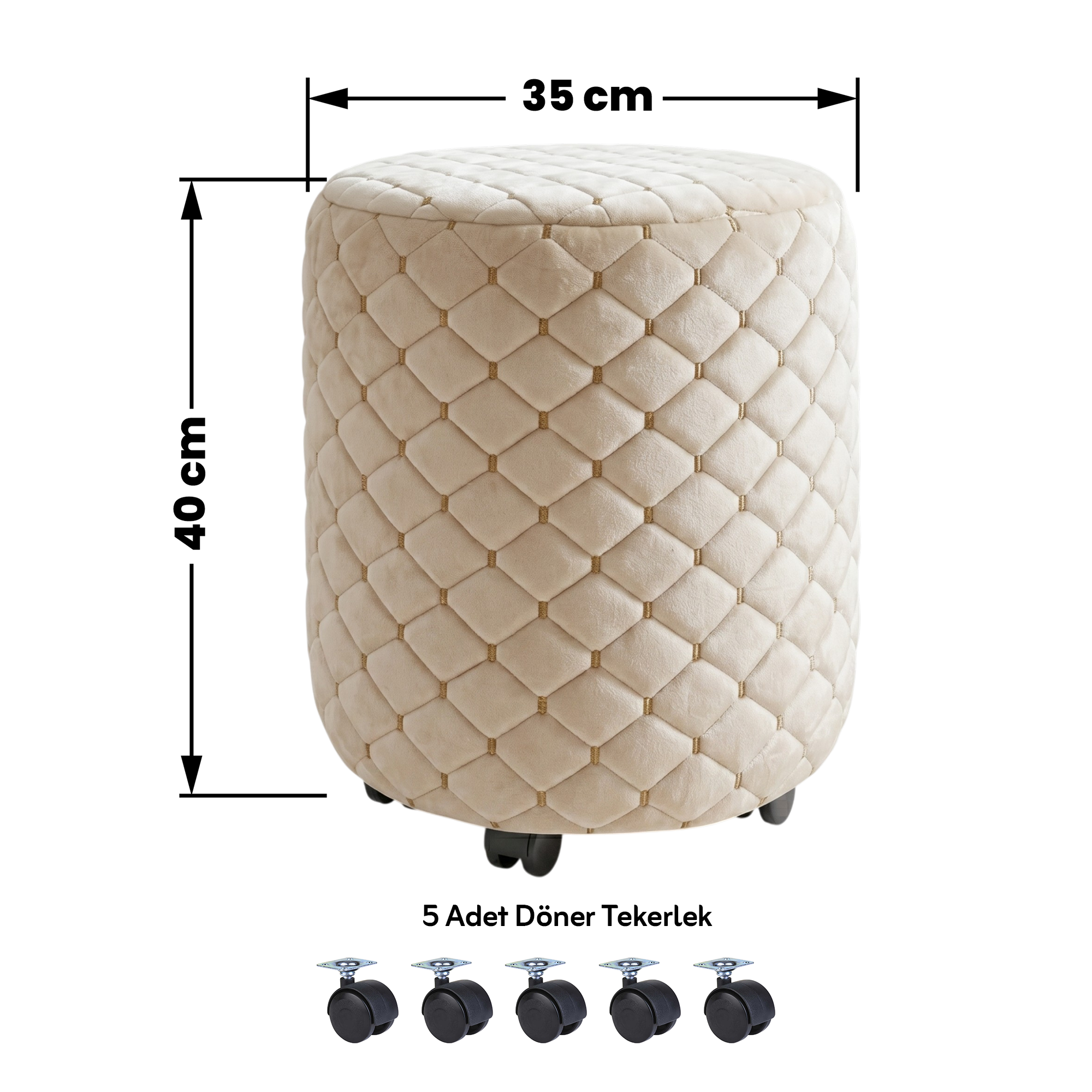 Modern tasarım ile fonksiyonelliği bir araya getiren Krem Luna Kumaş Tekerlekli Puf Tabure, yaşam alanlarınıza hem şıklık hem de konfor katar. Yumuşak dokulu luna kumaşı ve zarif kapitone desenleri ile estetik bir görünüm sunarken, 5 tekerlekli yapısı sayesinde kolayca hareket ettirilebilir.