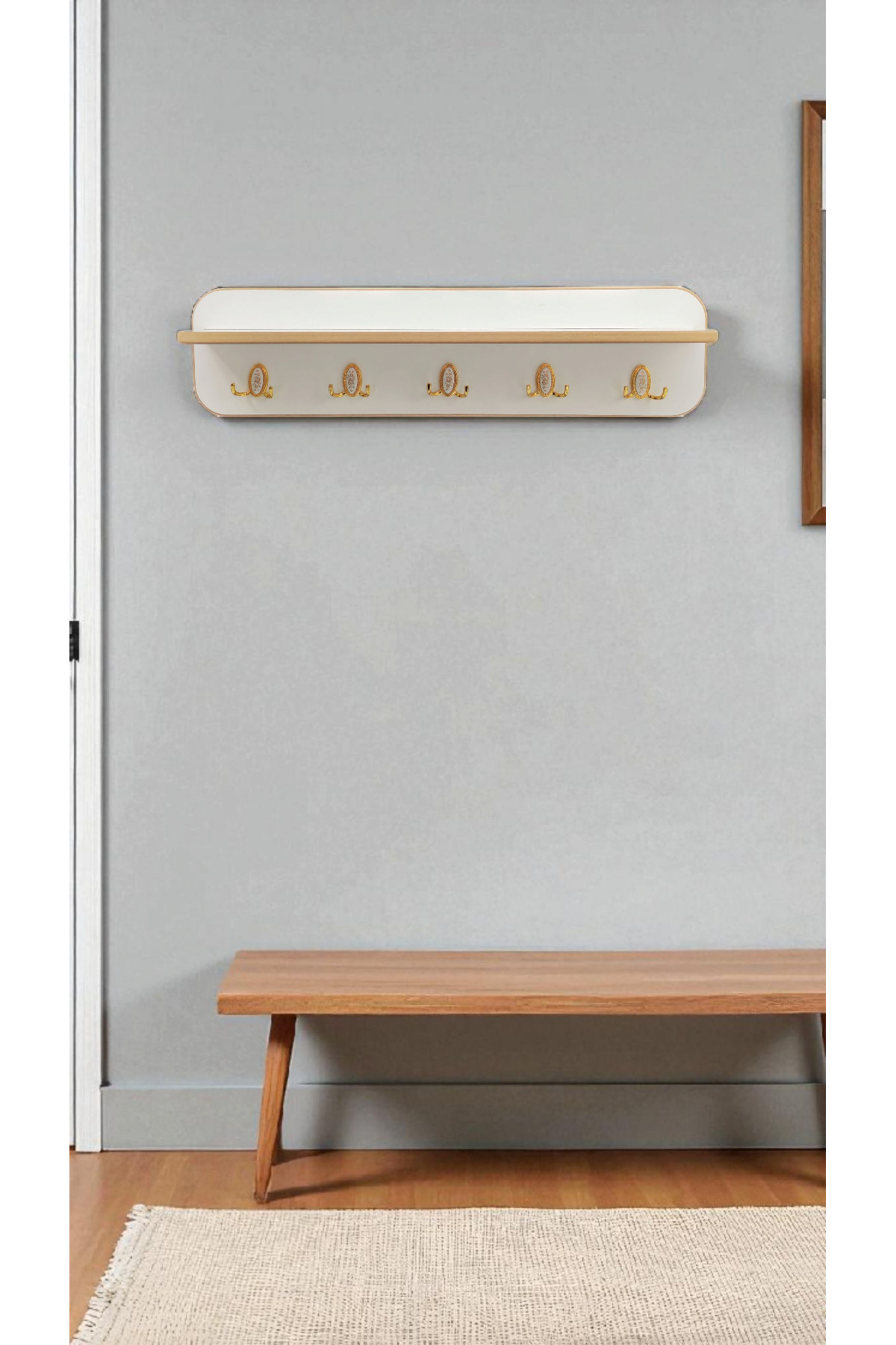 – Genişliği 87 cm olan bu portmanto, geniş giysi ve aksesuarlarınızı rahatça sergilemenize olanak tanır.; – Duvara monte edilebilir tasarımı sayesinde yerden tasarruf sağlar ve mekanınızda şık bir görünüm oluşturur.; – Yüksekliği 22 cm olan bu askılık, kolay erişim ve kullanım imkanı sunar.; – Dayanıklı MDF malzemesi ile uzun ömürlü kullanım vaat eder.; – Yerli üretim olmasıyla kalite standartlarına uygun olarak üretilmiştir.; – Modern stil sahibi beyaz rengiyle her türlü dekorasyona uyum sağlar.; – Web renk kodu beyaz olan bu ürün, temiz ve ferah bir atmosfer yaratmanız için idealdir.; – Sadece askılık satıştadır görsellerde ki diğer ürünler sadece dekor amaçlıdır.; Satışı yoktur.